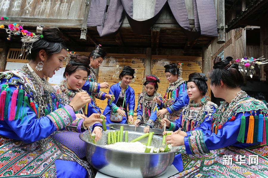 5月3日,貴州省首批魅力侗寨——榕江縣烏公侗寨歡度傳統(tǒng)的竹米節(jié),重溫侗民遠古農(nóng)耕風(fēng)情。竹米節(jié)也叫吃竹筍飯,在每年谷雨至立夏期間竹筍生長的時候,侗族群眾采摘斑竹筍,把糯米灌進筍筒煮熟食用。這樣既能保持米飯的原味,又有竹筍的清香,并且還方便攜帶至坡上田間地頭食用。久而久之,侗族人每到春夏之交的農(nóng)耕時節(jié)都會過竹米節(jié),殺豬宰羊祭祀侗族祖先,唱歌跳舞祈求五谷豐登。新華社發(fā)(楊成利 攝)