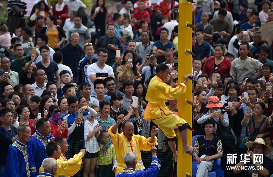 農(nóng)歷十月十五前后,福建西部武平縣各山村陸續(xù)進(jìn)入農(nóng)閑時(shí)節(jié)。按照當(dāng)?shù)仫L(fēng)俗,不同村子各自擇日舉辦民間活動(dòng),其中較有代表性的就是“上刀山”絕技?!吧系渡健苯^技在閩西山村流傳已有數(shù)百年歷史,表演者需光腳順著磨得鋒利閃亮的36把鋼刀,攀登至8米高的杉木柱子頂部,接受長(zhǎng)者祝福,祈求風(fēng)調(diào)雨順、五谷豐登。新華社記者 宋為偉 攝