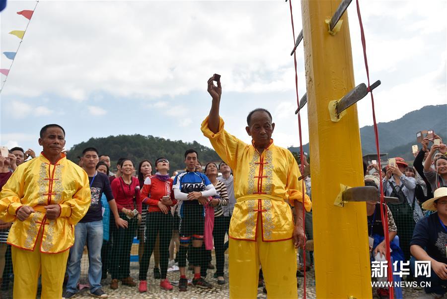 農(nóng)歷十月十五前后,福建西部武平縣各山村陸續(xù)進(jìn)入農(nóng)閑時(shí)節(jié)。按照當(dāng)?shù)仫L(fēng)俗,不同村子各自擇日舉辦民間活動(dòng),其中較有代表性的就是“上刀山”絕技。“上刀山”絕技在閩西山村流傳已有數(shù)百年歷史,表演者需光腳順著磨得鋒利閃亮的36把鋼刀,攀登至8米高的杉木柱子頂部,接受長(zhǎng)者祝福,祈求風(fēng)調(diào)雨順、五谷豐登。新華社記者 宋為偉 攝