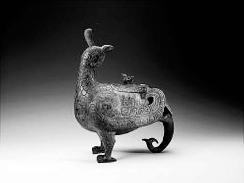 鳥與象,是西周時(shí)期最流行的肖形裝飾,尤為晉人所鐘愛。大鳥回眸,小鳥偎依,巨象縮首,構(gòu)思奇特,想象卓絕,華美的造型藝術(shù)和精巧的實(shí)用功能,完美組合于此尊,使之成為中國(guó)青銅藝術(shù)中罕見的珍品。山西博物院的“鎮(zhèn)館之寶”鳥尊高39厘米,長(zhǎng)30.5厘米,寬17.5厘米,出土自山西省曲沃縣北趙村晉侯墓地114號(hào)墓,鳥尊上的銘文寫著“晉侯作向太室寶尊彝”,表明這是晉侯宗廟祭祀的禮器。據(jù)考證,這件國(guó)寶的擁有者就是改唐為晉的第一代晉侯——燮父。