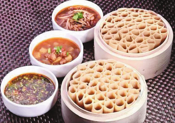莜面栲栳栳。莜面栲栳栳又叫“莜面窩窩”,是過去老百姓農(nóng)忙時(shí)節(jié)為省事普遍愛做的一種飯食。它工藝講究,成形美觀,口感筋道,再加上“羊肉臊子臺(tái)蘑湯”,真可謂“一家吃著十家香”,難怪就連康熙皇帝朝拜五臺(tái)山時(shí),也以品此為人生快事。其做法是:和面時(shí)加以燒開的水,用筷子攪拌成面絮,趁熱將其揉成光滑的面團(tuán);取一小塊放在光滑的面板上,用手掌使巧勁一搓,然后撕起來往食指上繞,卷成中間空的小卷,豎在蒸籠里;最后放在沸水鍋上蒸10分鐘即熟,蒸時(shí)要注意火候,火候不到會(huì)不熟,蒸得過火則軟癱立不起來,吃時(shí)味欠色減。