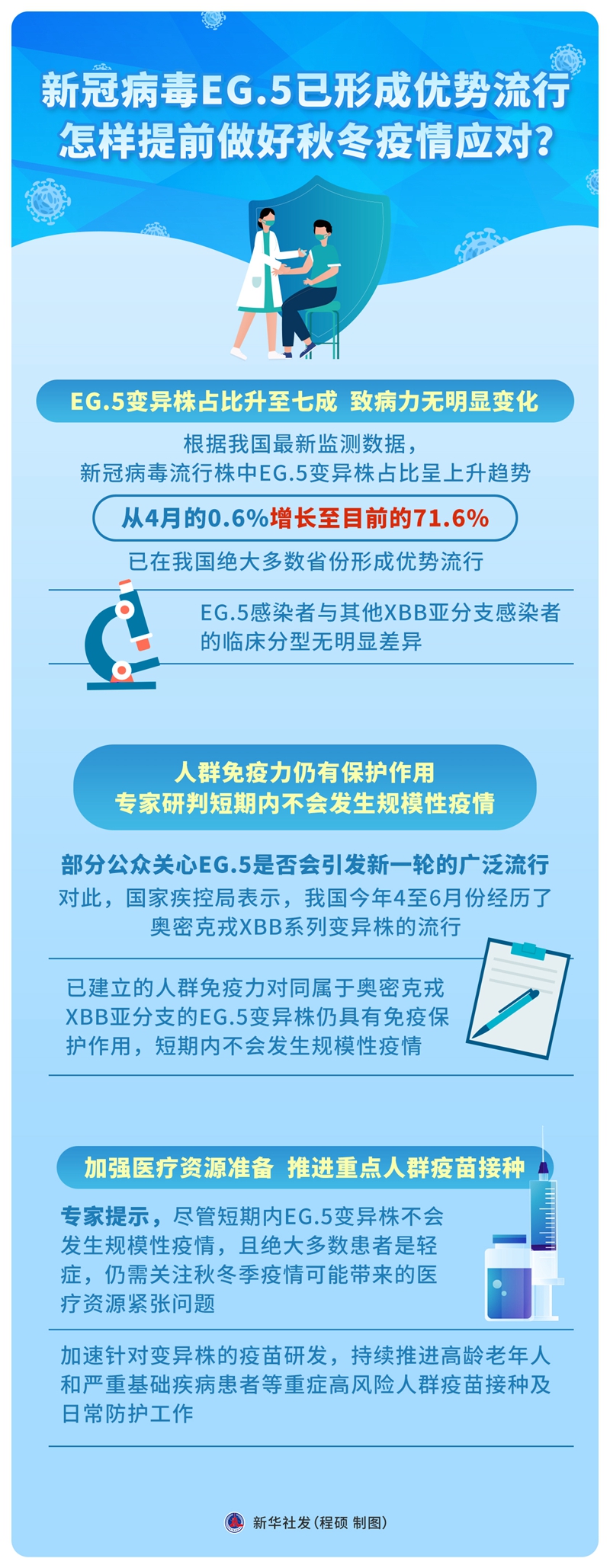 專家提示,盡管短期內(nèi)EG.5變異株不會發(fā)生規(guī)模性疫情,且絕大多數(shù)患者是輕癥,仍需關注秋冬季疫情可能帶來的醫(yī)療資源緊張問題,加速針對變異株的疫苗研發(fā),持續(xù)推進高齡老年人和嚴重基礎疾病患者等重癥高風險人群疫苗接種及日常防護工作。