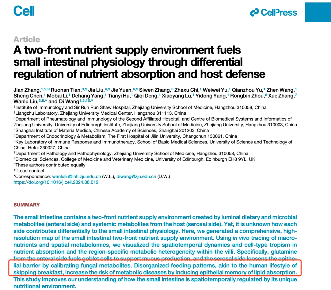 日前,浙江大學(xué)醫(yī)學(xué)院附屬邵逸夫醫(yī)院、浙江大學(xué)愛丁堡大學(xué)聯(lián)合學(xué)院、中國科學(xué)院上海藥物研究所的研究團(tuán)隊(duì),在頂尖學(xué)術(shù)期刊《細(xì)胞》(Cell)上合作發(fā)表一篇論文表明,不吃早餐的這種飲食習(xí)慣會改變小腸對營養(yǎng)物質(zhì)的吸收方式,從而會增加代謝性疾病的風(fēng)險。