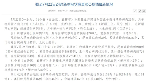 人民網(wǎng)北京7月23日電(董童)國(guó)家衛(wèi)生健康委于今日在官網(wǎng)發(fā)布的《截至7月22日24時(shí)新型冠狀病毒肺炎疫情最新情況》(以下簡(jiǎn)稱(chēng)“情況”)提出,7月22日0—24時(shí),31個(gè)省(自治區(qū)、直轄市)和新疆生產(chǎn)建設(shè)兵團(tuán)報(bào)告新增確診病例22例,其中境外輸入病例3例(上海1例,廣東1例,陜西1例),本土病例19例(新疆18例,遼寧1例);無(wú)新增死亡病例;新增疑似病例3例,其中境外輸入病例2例(均在上海),本土病例1例(在遼寧)。當(dāng)日新增治愈出院病例15例,解除醫(yī)學(xué)觀(guān)察的密切接觸者378人,重癥病例較前一日增加5例。