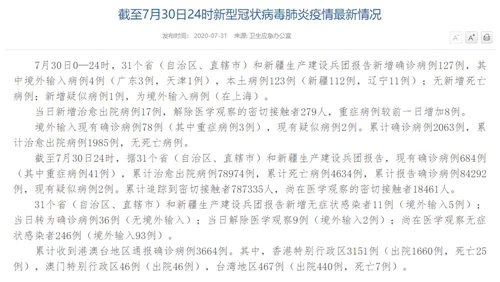 情況顯示,截至7月30日24時,據(jù)31個省(自治區(qū)、直轄市)和新疆生產(chǎn)建設(shè)兵團(tuán)報告,現(xiàn)有確診病例684例(其中重癥病例41例),累計治愈出院病例78974例,累計死亡病例4634例,累計報告確診病例84292例,現(xiàn)有疑似病例2例。累計追蹤到密切接觸者787335人,尚在醫(yī)學(xué)觀察的密切接觸者18461人。