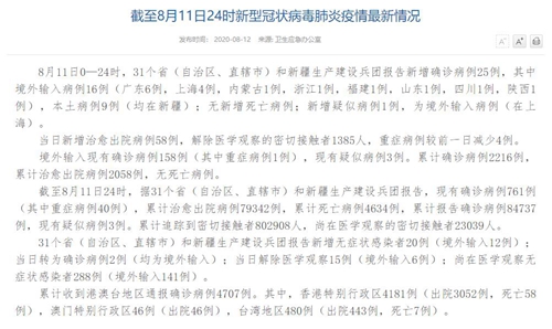 人民網北京8月12日電(董童)國家衛(wèi)生健康委于今日在官網發(fā)布的《截至8月11日24時新型冠狀病毒肺炎疫情最新情況》(以下簡稱“情況”)提出,8月11日0—24時,31個省(自治區(qū)、直轄市)和新疆生產建設兵團報告新增確診病例25例,其中境外輸入病例16例(廣東6例,上海4例,內蒙古1例,浙江1例,福建1例,山東1例,四川1例,陜西1例),本土病例9例(均在新疆);無新增死亡病例;新增疑似病例1例,為境外輸入病例(在上海)。當日新增治愈出院病例58例,解除醫(yī)學觀察的密切接觸者1385人,重癥病例較前一日減少4例。