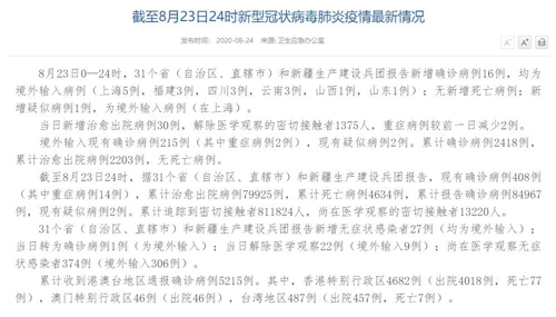 人民網(wǎng)北京8月24日電(董童)國家衛(wèi)生健康委于今日在官網(wǎng)發(fā)布的《截至8月23日24時新型冠狀病毒肺炎疫情最新情況》(以下簡稱“情況”)提出,8月23日0—24時,31個?。ㄗ灾螀^(qū)、直轄市)和新疆生產(chǎn)建設(shè)兵團(tuán)報告新增確診病例16例,均為境外輸入病例(上海5例,福建3例,四川3例,云南3例,山西1例,山東1例);無新增死亡病例;新增疑似病例1例,為境外輸入病例(在上海)。當(dāng)日新增治愈出院病例30例,解除醫(yī)學(xué)觀察的密切接觸者1375人,重癥病例較前一日減少2例。