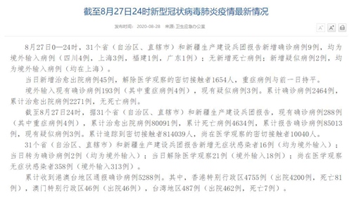 情況顯示,截至8月27日24時,據(jù)31個?。ㄗ灾螀^(qū)、直轄市)和新疆生產(chǎn)建設(shè)兵團報告,現(xiàn)有確診病例288例(其中重癥病例4例),累計治愈出院病例80091例,累計死亡病例4634例,累計報告確診病例85013例,現(xiàn)有疑似病例3例。累計追蹤到密切接觸者814039人,尚在醫(yī)學(xué)觀察的密切接觸者10040人。