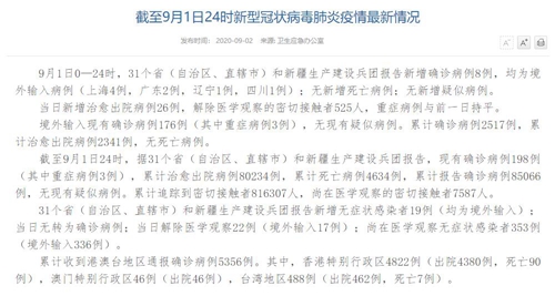 截至9月1日24時,據(jù)31個?。ㄗ灾螀^(qū)、直轄市)和新疆生產(chǎn)建設(shè)兵團報告,現(xiàn)有確診病例198例(其中重癥病例3例),累計治愈出院病例80234例,累計死亡病例4634例,累計報告確診病例85066例,無現(xiàn)有疑似病例。累計追蹤到密切接觸者816307人,尚在醫(yī)學(xué)觀察的密切接觸者7587人。