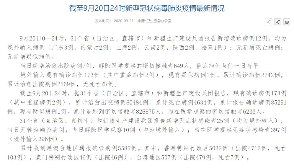 人民網(wǎng)北京9月21日電(董童)國家衛(wèi)生健康委于今日在官網(wǎng)發(fā)布的《截至9月20日24時新型冠狀病毒肺炎疫情最新情況》(以下簡稱“情況”)提出,9月20日0—24時,31個?。ㄗ灾螀^(qū)、直轄市)和新疆生產(chǎn)建設(shè)兵團(tuán)報告新增確診病例12例,均為境外輸入病例(廣東3例,內(nèi)蒙古2例,上海2例,云南2例,陜西2例,福建1例);無新增死亡病例;無新增疑似病例。當(dāng)日新增治愈出院病例7例,解除醫(yī)學(xué)觀察的密切接觸者649人,重癥病例與前一日持平。