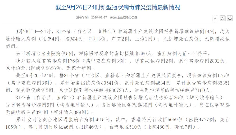 人民網(wǎng)北京9月27日電(董童)國家衛(wèi)生健康委于今日在官網(wǎng)發(fā)布的《截至9月26日24時新型冠狀病毒肺炎疫情最新情況》(以下簡稱“情況”)提出,9月26日0—24時,31個?。ㄗ灾螀^(qū)、直轄市)和新疆生產(chǎn)建設(shè)兵團報告新增確診病例14例,均為境外輸入病例(遼寧4例,福建4例,四川3例,廣東2例,上海1例);無新增死亡病例;無新增疑似病例。當日新增治愈出院病例5例,解除醫(yī)學(xué)觀察的密切接觸者560人,重癥病例與前一日持平。