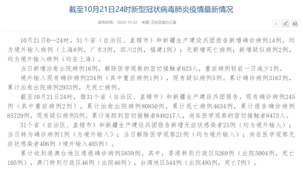人民網(wǎng)北京10月22日電(董童)國家衛(wèi)生健康委于今日在官網(wǎng)發(fā)布的《截至10月21日24時新型冠狀病毒肺炎疫情最新情況》(以下簡稱“情況”)提出,10月21日0—24時,31個?。ㄗ灾螀^(qū)、直轄市)和新疆生產(chǎn)建設(shè)兵團報告新增確診病例14例,均為境外輸入病例(上海8例,廣東3例,四川2例,福建1例);無新增死亡病例;新增疑似病例2例,均為境外輸入病例(均在上海)。當(dāng)日新增治愈出院病例16例,解除醫(yī)學(xué)觀察的密切接觸者623人,重癥病例較前一日減少1例。