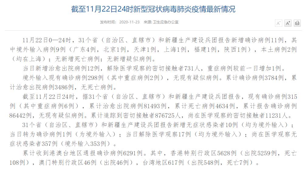 人民網(wǎng)北京11月23日電(董童)國(guó)家衛(wèi)生健康委于今日在官網(wǎng)發(fā)布的《截至11月22日24時(shí)新型冠狀病毒肺炎疫情最新情況》(以下簡(jiǎn)稱“情況”)指出,11月22日0—24時(shí),31個(gè)?。ㄗ灾螀^(qū)、直轄市)和新疆生產(chǎn)建設(shè)兵團(tuán)報(bào)告新增確診病例11例,其中境外輸入病例9例(廣東4例,北京1例,天津1例,上海1例,福建1例,陜西1例),本土病例2例(均在上海);無(wú)新增死亡病例;無(wú)新增疑似病例。當(dāng)日新增治愈出院病例12例,解除醫(yī)學(xué)觀察的密切接觸者731人,重癥病例較前一日增加1例。