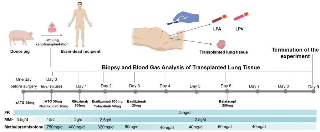 廣州醫(yī)科大學(xué)附屬第一醫(yī)院教授何建行率領(lǐng)的研究團(tuán)隊(duì),將一只經(jīng)過基因編輯的巴馬香豬左肺移植到一名腦死亡者體內(nèi),模擬臨床常見的單肺移植手術(shù)。該供體豬經(jīng)過6處基因編輯,以降低其器官移植到人體后的免疫風(fēng)險(xiǎn)。手術(shù)后,呼吸、血液、影像等監(jiān)測(cè)數(shù)據(jù)顯示,移植肺維持通氣與氣體交換功能長達(dá)9天,其間未發(fā)生超急性排異反應(yīng),同步病原學(xué)監(jiān)測(cè)也未發(fā)現(xiàn)活躍感染跡象。