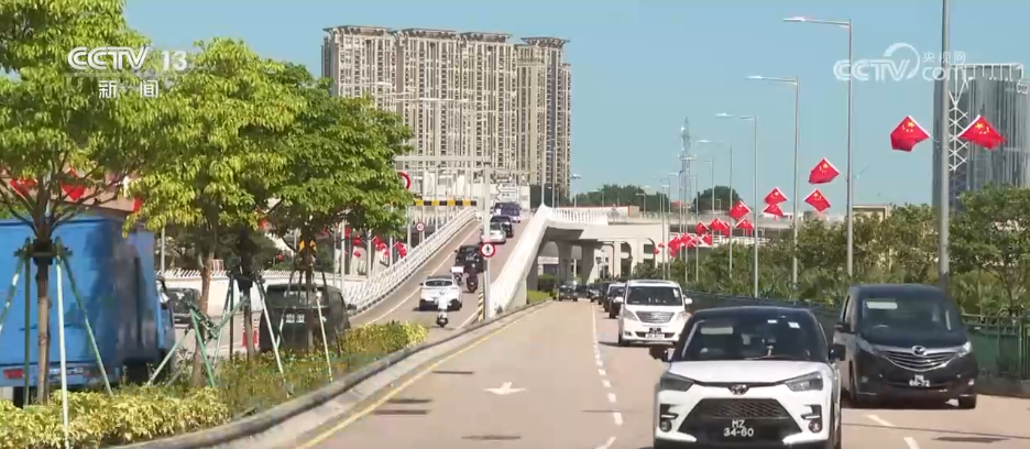 在澳門的主要街道、出入境口岸等地,鮮艷的五星紅旗迎風(fēng)飄揚,在藍天、綠樹的映襯下,構(gòu)成了一道道亮麗的風(fēng)景線,為城市增添了喜慶祥和的國慶氛圍。