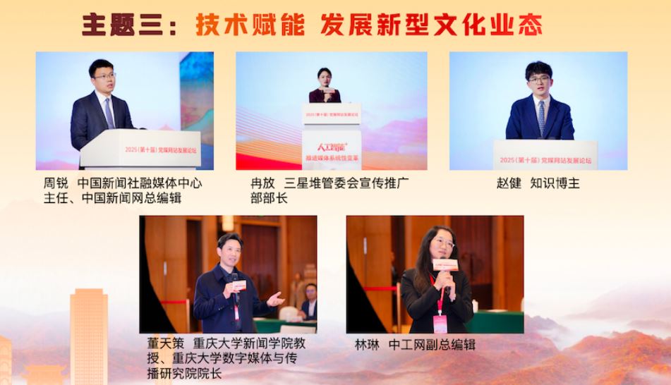在“技術(shù)賦能 發(fā)展新型文化業(yè)態(tài)”主題研討環(huán)節(jié),中國新聞社融媒體中心主任、中國新聞網(wǎng)總編輯周銳,三星堆管委會(huì)宣傳推廣部部長冉放,知識(shí)博主趙健,分別就技術(shù)賦能中華文化“破圈”出海、三星堆文化傳播數(shù)智實(shí)踐、短視頻文化傳播等方面的經(jīng)驗(yàn)成果進(jìn)行了精彩展示。重慶大學(xué)新聞學(xué)院教授、重慶大學(xué)數(shù)字媒體與傳播研究院院長董天策,中工網(wǎng)副總編輯林琳作為互動(dòng)嘉賓進(jìn)行了點(diǎn)評(píng),期待主流媒體發(fā)揮傳播實(shí)踐智慧,在內(nèi)容、技術(shù)和社會(huì)責(zé)任之間找到平衡,鑄造中華文化新輝煌。