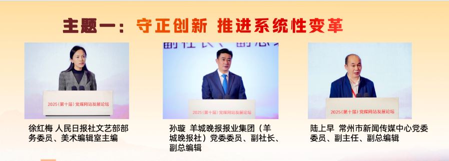 在“守正創(chuàng)新 推進(jìn)系統(tǒng)性變革”主題研討環(huán)節(jié),人民日報(bào)社文藝部部務(wù)委員、美術(shù)編輯室主編徐紅梅,羊城晚報(bào)報(bào)業(yè)集團(tuán)(羊城晚報(bào)社)黨委委員、副社長、副總編輯孫璇,常州市新聞傳媒中心黨委委員、副主任、副總編輯陸上早分別作主旨發(fā)言,介紹了各自領(lǐng)域推進(jìn)系統(tǒng)性變革、發(fā)展新時(shí)代中國特色社會(huì)主義文化的實(shí)踐與探索。徐紅梅表示,“每日讀畫”采取“AI+美術(shù)”“微視頻+夜讀”的形式,堅(jiān)持“讀準(zhǔn)、讀細(xì)、讀新、讀美”,讓AI成為深入畫境、開啟古今對(duì)話的共創(chuàng)者,以動(dòng)態(tài)轉(zhuǎn)譯、意境擴(kuò)展、流程再造、視聽融合開發(fā)美術(shù)融媒的敘事潛能,深入挖掘中華文明賡續(xù)傳承的基因密碼,成為探索主流媒體系統(tǒng)性變革的微觀樣本。孫璇表示,羊城晚報(bào)全面啟動(dòng)系統(tǒng)性變革,以做強(qiáng)媒體、文化、數(shù)據(jù)、產(chǎn)業(yè)四個(gè)戰(zhàn)略板塊為重點(diǎn),把“技術(shù)賦能”嵌入系統(tǒng)性變革各關(guān)鍵板塊,積極增強(qiáng)文化傳播、促進(jìn)文化交流和繁榮文化生產(chǎn)。陸上早表示,常州借“蘇超”東風(fēng),走出城市轉(zhuǎn)型與能級(jí)躍升之路。改革的推進(jìn)需聚焦六大方向:組織體系化,內(nèi)容精品化,傳播移動(dòng)化,技術(shù)現(xiàn)代化,分配績效化,干部年輕化。