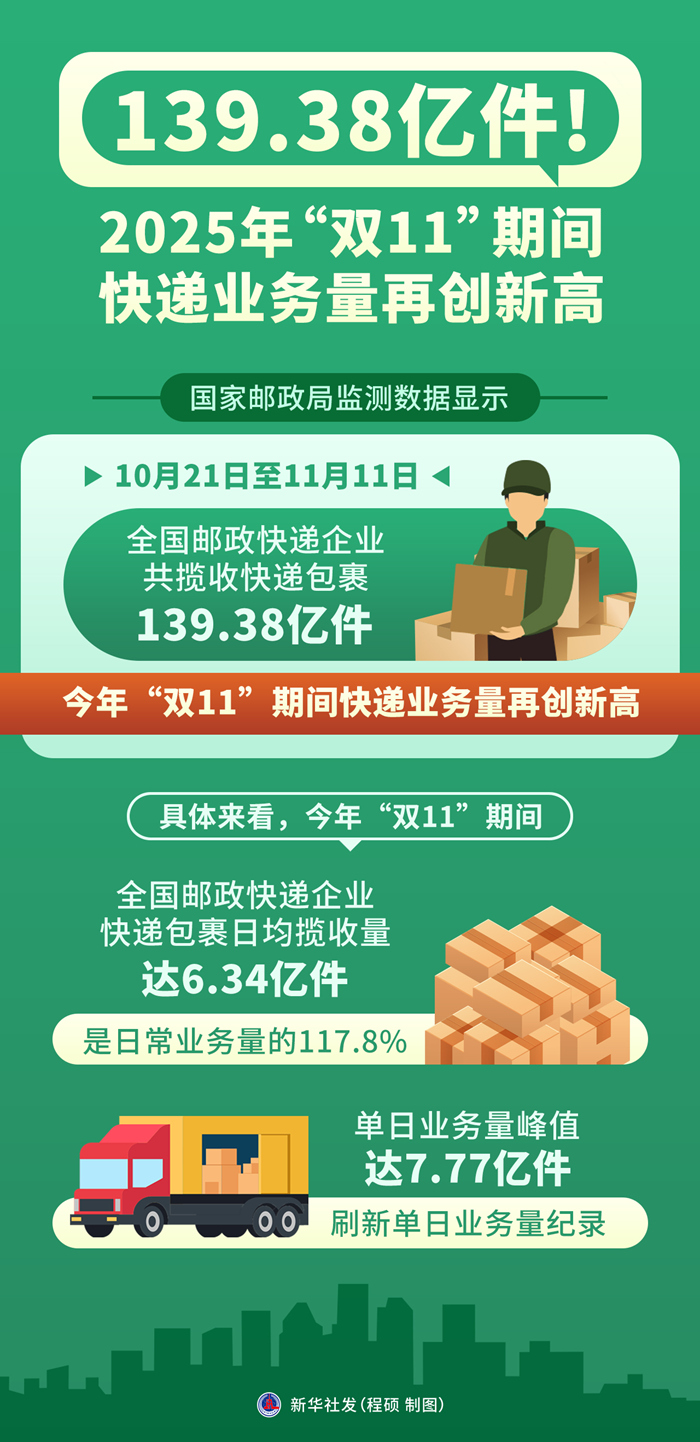 新華社北京11月12日電(記者葉昊鳴)記者11月12日從國家郵政局獲悉,國家郵政局監(jiān)測數(shù)據(jù)顯示,10月21日至11月11日,全國郵政快遞企業(yè)共攬收快遞包裹139.38億件,今年“雙11”期間快遞業(yè)務(wù)量再創(chuàng)新高。