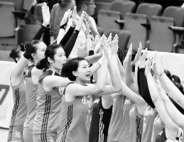 9月9日,中國(guó)女排隊(duì)員相互激勵(lì)。當(dāng)日,女排大冠軍杯比賽繼續(xù)在日本名古屋綜合體育館進(jìn)行。中國(guó)女排以3比0戰(zhàn)勝俄羅斯女排,取得了第四場(chǎng)勝利。
