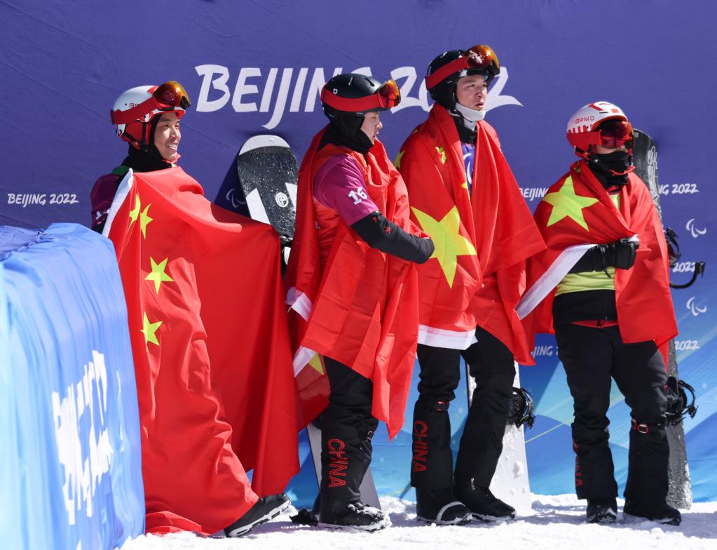 四面五星紅旗分別披在四位選手身上,他們享受著來自場內(nèi)四面八方的歡呼。他們的名字是紀(jì)立家、王鵬耀、朱永鋼、張義琦,他們是北京冬殘奧會殘奧單板滑雪男子障礙追逐UL級比賽大決賽的全部四名參賽選手,冠亞季殿軍獲得者。