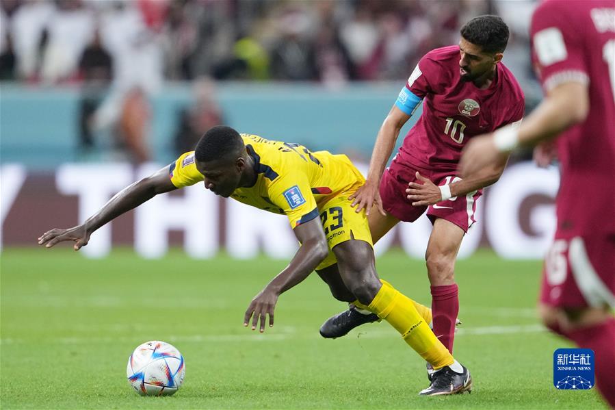11月20日,厄瓜多爾隊球員莫伊塞斯·凱塞多(左)與卡塔爾隊球員哈?!ず6嗨乖诒荣愔衅磽尅P氯A社記者 鄭煥松 攝