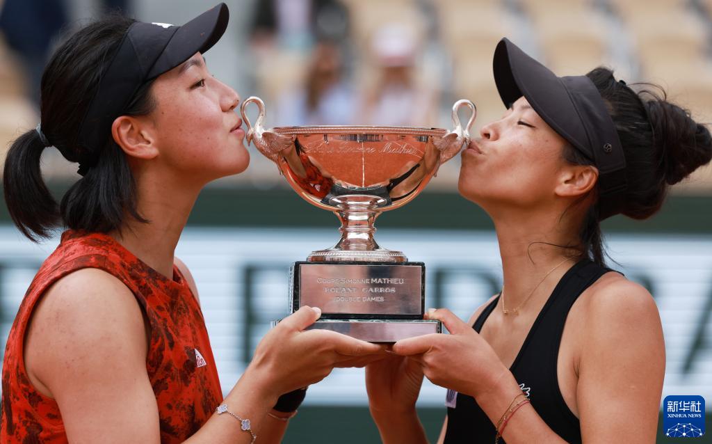 6月11日,王欣瑜(左)/謝淑薇親吻女雙冠軍獎(jiǎng)杯。新華社記者 高靜 攝