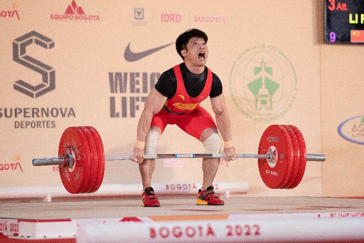 2022年12月7日,中國選手李發(fā)彬在挺舉比賽中。新華社記者王天聰攝