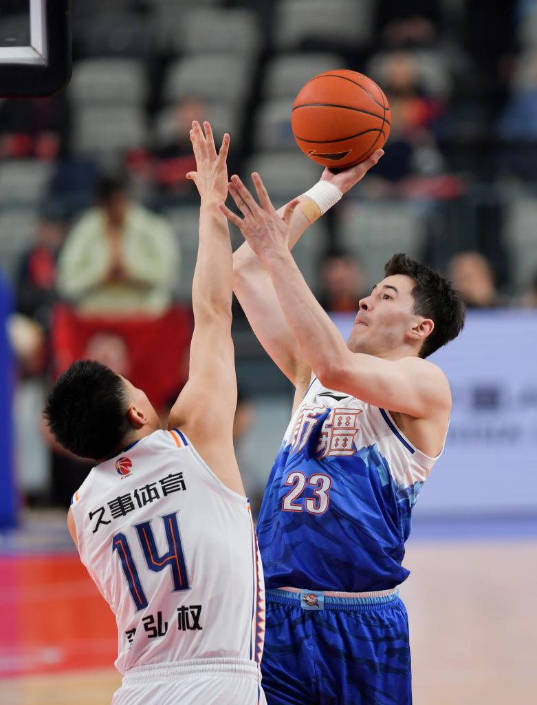 12月20日,新疆隊球員阿不都沙拉木(右)在比賽中投籃。新華社記者王菲攝