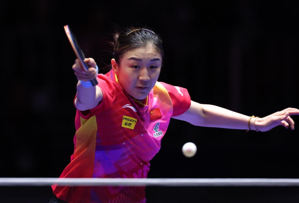 2月21日,中國隊球員陳夢在第一盤比賽中回球。新華社記者 楊世堯 攝