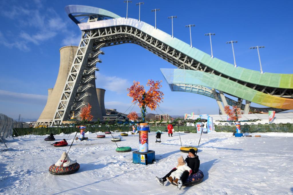 2023年12月24日,游客在首鋼滑雪大跳臺下的“首鋼園冰雪匯”體驗雪上游樂項目。新華社記者 鞠煥宗 攝