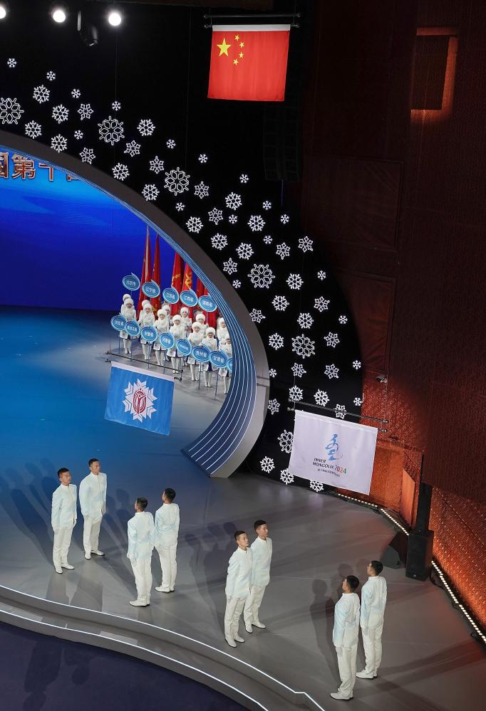 冰雪相約,同心筑夢(mèng)。27日20時(shí)許,“十四冬”閉幕式在呼倫貝爾大劇院開始。在歡快熱烈的氣氛中,各參賽代表團(tuán)旗幟入場(chǎng)。全體起立,奏唱中華人民共和國(guó)國(guó)歌。