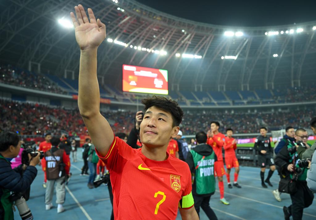3月26日,武磊在2026年國際足聯(lián)世界杯亞洲區(qū)預(yù)選賽36強(qiáng)賽C組中國隊(duì)主場(chǎng)4:1戰(zhàn)勝新加坡隊(duì)的比賽后向觀眾致意。新華社記者 孫凡越 攝