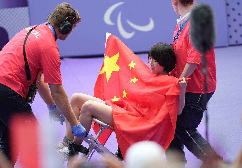 9月1日,中國選手史逸婷賽后在醫(yī)護(hù)人員的幫助下離場。新華社記者 才揚 攝