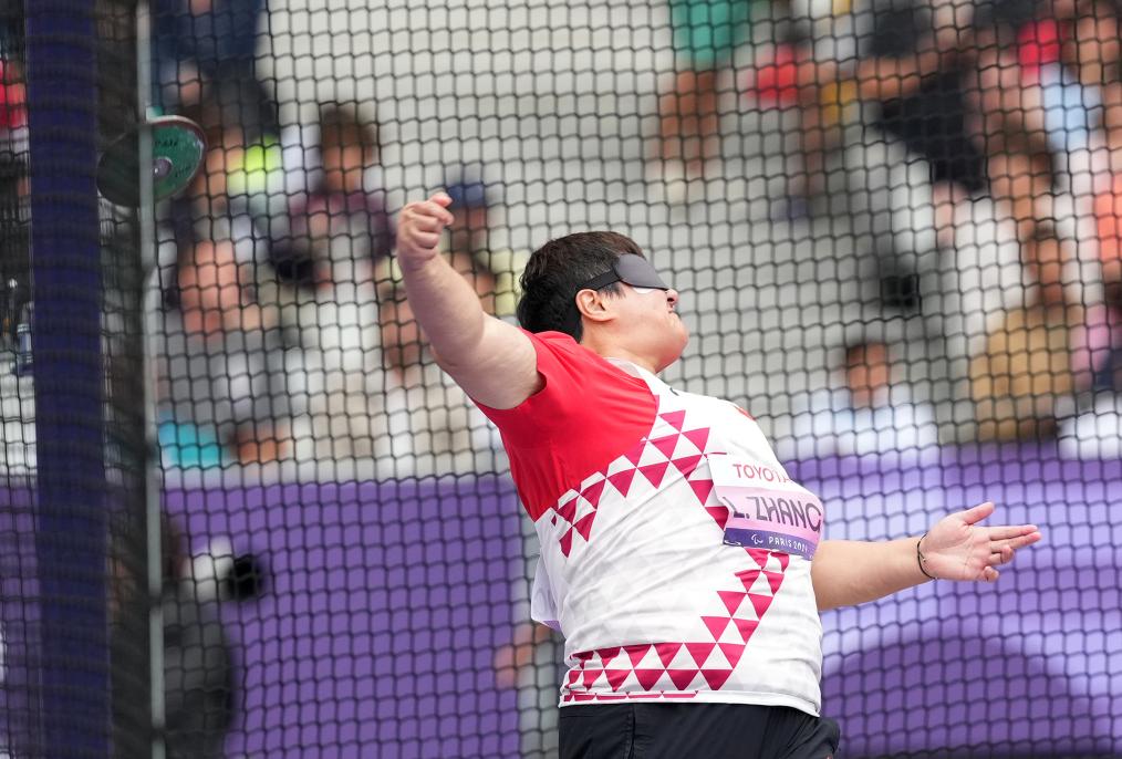 9月3日,張亮敏在比賽中試投。當(dāng)日,在巴黎殘奧會田徑女子鐵餅F11級決賽中,中國選手張亮敏以39米08的成績獲得金牌。新華社記者 賀燦鈴 攝