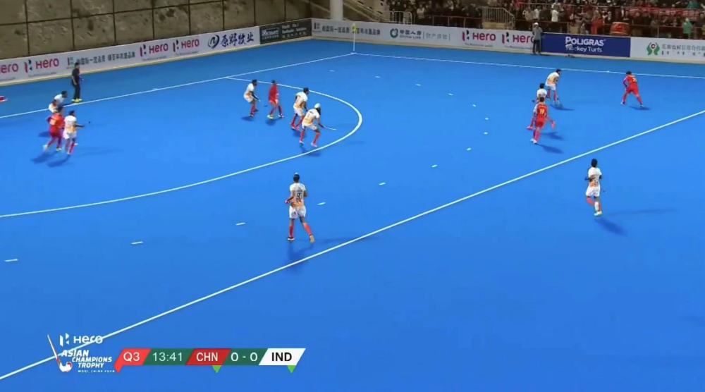第二節(jié),面對(duì)印度隊(duì)的強(qiáng)勢(shì)進(jìn)攻,中國隊(duì)幾次成功搶斷,場(chǎng)面十分膠著。第三節(jié),印度隊(duì)在禁區(qū)內(nèi)攔球犯規(guī),中國隊(duì)獲得短角球,然而在印度隊(duì)嚴(yán)密的防守下射偏。隨著比賽的進(jìn)行,中國隊(duì)隊(duì)員體力有所下降,但依然在場(chǎng)上頑強(qiáng)拼搏。第四節(jié),印度隊(duì)通過團(tuán)隊(duì)配合取得進(jìn)球,中國隊(duì)調(diào)整戰(zhàn)術(shù),將守門員換下,全力進(jìn)攻,但未能扭轉(zhuǎn)局勢(shì),最終以0:1惜敗。