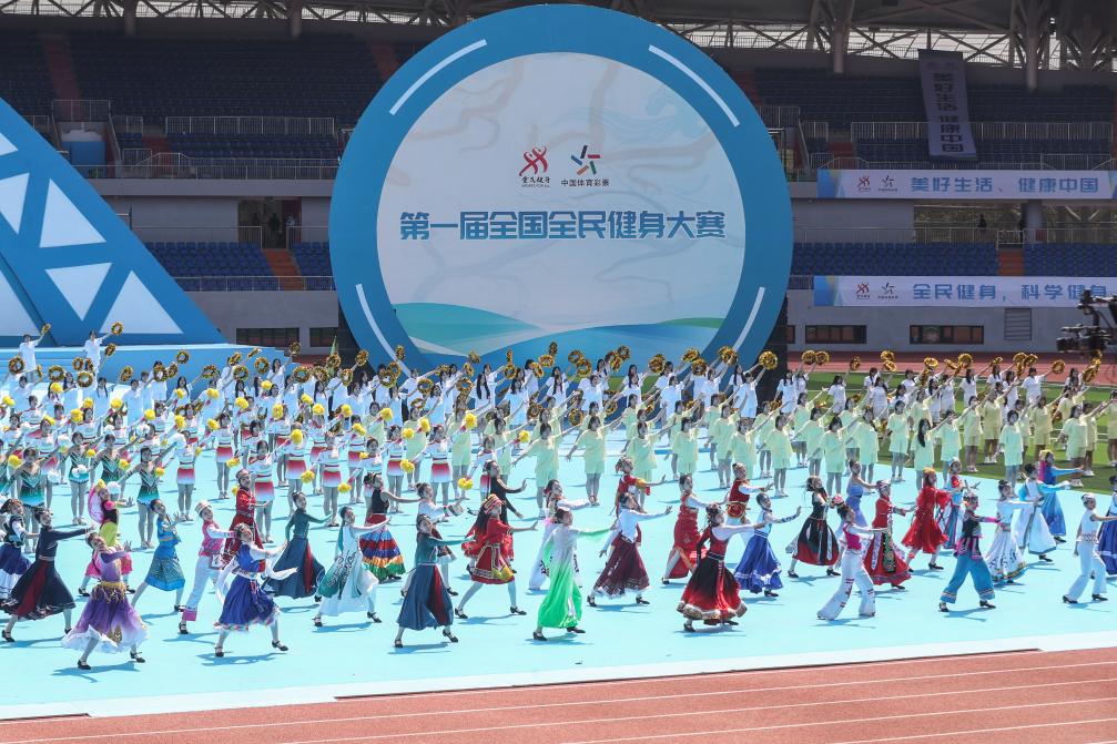 5月20日,演員在第一屆全國(guó)全民健身大賽開(kāi)幕式現(xiàn)場(chǎng)進(jìn)行表演。新華社記者 潘昱龍 攝