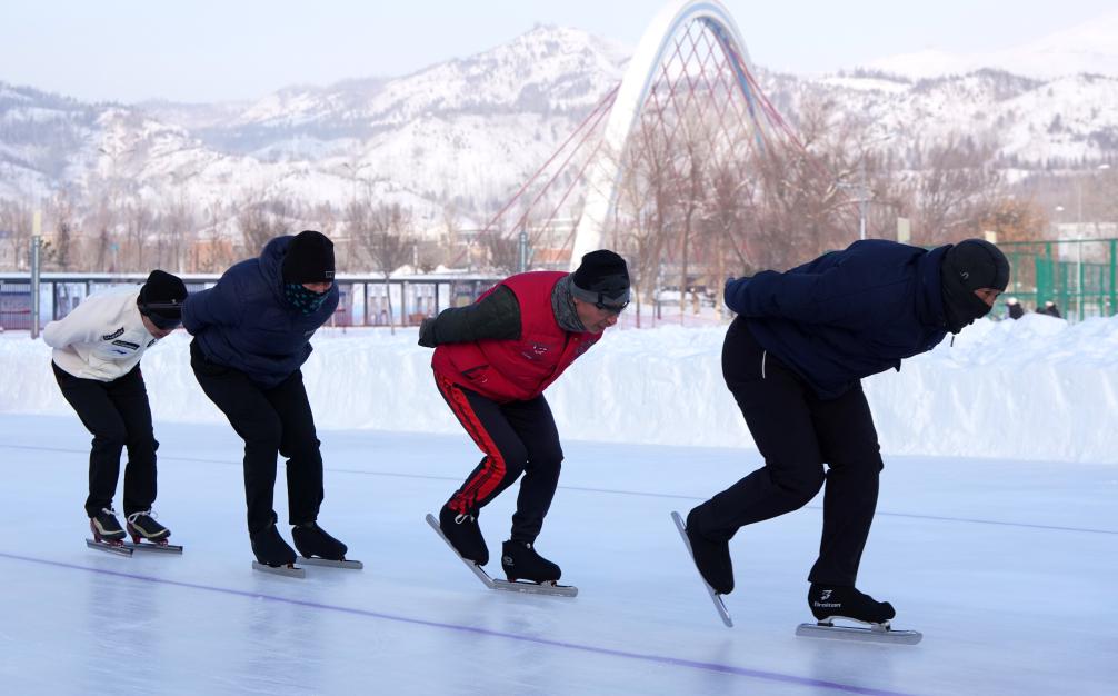不一會(huì)兒,一群孩子涌入冰場(chǎng),他們是阿勒泰市業(yè)余體校的小運(yùn)動(dòng)員,年齡8到15歲不等。他們脫下厚重的棉衣,換上連身服,開始在冰面上滑行,在教練的指揮下,時(shí)而沖刺,時(shí)而慢行調(diào)整,輕快的腳步讓“老朋友們”贊嘆,“這些小孩厲害啊,比我們那會(huì)兒強(qiáng)多了”。