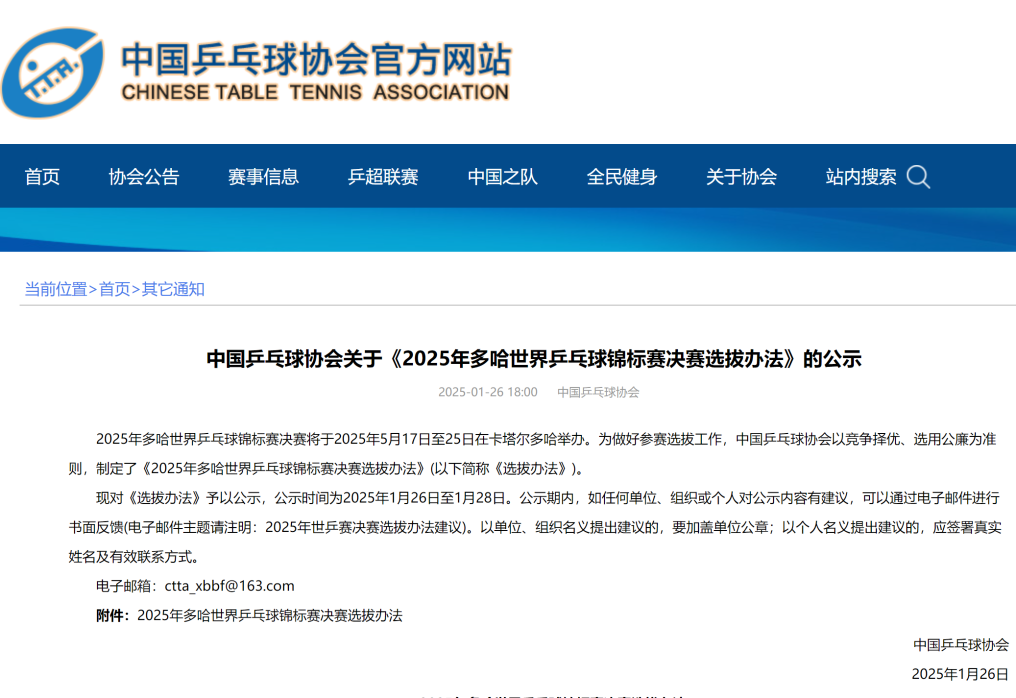 中國乒協(xié)官網(wǎng)截圖