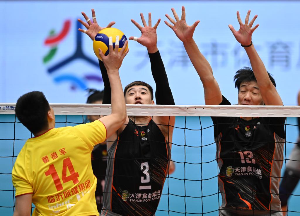 3月6日,天津男排球員毛天一(中)與隊友陳龍海(右)在比賽中攔防山東男排球員翟德軍的扣球。新華社記者 孫凡越 攝