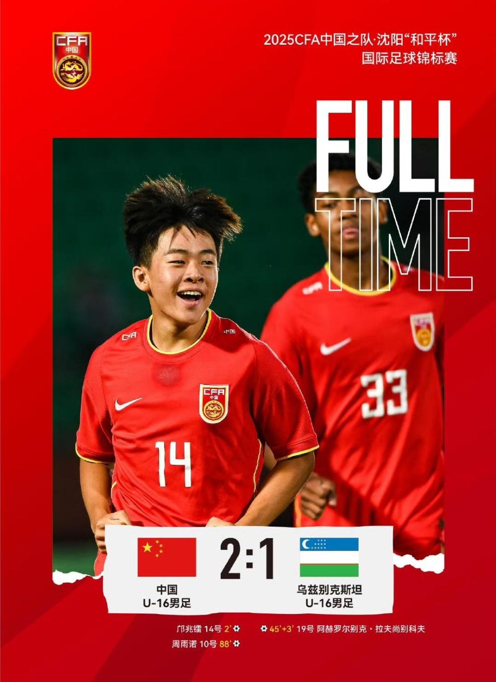 上半場(chǎng)雙方各打進(jìn)一粒進(jìn)球。開(kāi)場(chǎng)僅兩分鐘,何思凡左路傳中,鄺兆鐳跟上破門(mén),幫助中國(guó)隊(duì)以1:0領(lǐng)先對(duì)手。隨后,中國(guó)隊(duì)險(xiǎn)些擴(kuò)大分差,王非尼亞突破造成點(diǎn)球并由自己主罰,一腳“勺子”點(diǎn)球因角度不佳被對(duì)方門(mén)將撲出。上半場(chǎng)傷停補(bǔ)時(shí)階段,沉寂許久的烏茲別克斯坦隊(duì)抓住機(jī)會(huì),拉夫尚別科夫接住隊(duì)友的斜吊傳中,頭球攻門(mén)扳平比分。易邊再戰(zhàn),雙方拼搶激烈,多次在對(duì)方禁區(qū)制造威脅,但都差“臨門(mén)一腳”。直到第88分鐘,中國(guó)隊(duì)?wèi){借角球獲得二次進(jìn)攻機(jī)會(huì),周雨諾“一劍封喉”,以一腳遠(yuǎn)射破門(mén)鎖定勝局。加上此前和日本隊(duì)?wèi)?zhàn)平,中國(guó)隊(duì)以一勝一平暫居積分榜次席。