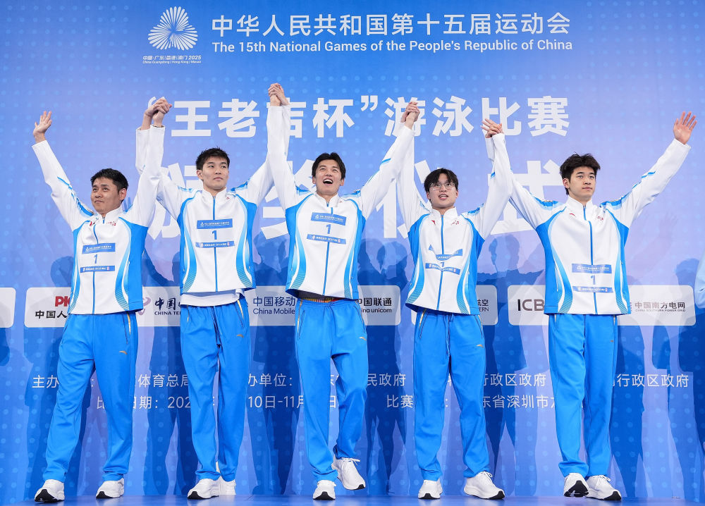 11月10日,冠軍浙江隊選手和教練在頒獎儀式上。當(dāng)日,第十五屆全國運(yùn)動會游泳項目男子4X100米自由泳接力決賽在深圳舉行。新華社記者 杜宇 攝