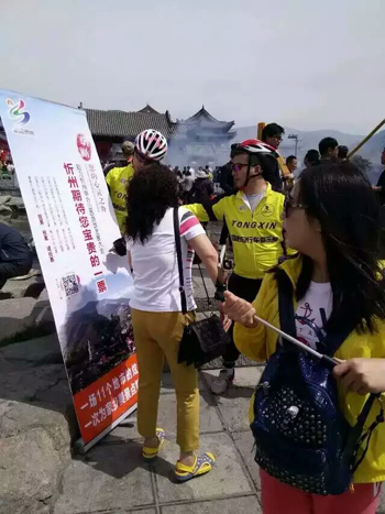 5月19日,在第六個(gè)“中國(guó)旅游日”,共青團(tuán)五臺(tái)縣委組織20余名青年騎行愛好者,騎著單車來(lái)到五臺(tái)山核心景區(qū),拉起宣傳畫,耐心向來(lái)山游客講解投票方法,動(dòng)員廣大游客為忻州申辦山西旅游發(fā)展大會(huì)投下寶貴一票。(劉力強(qiáng) 攝)