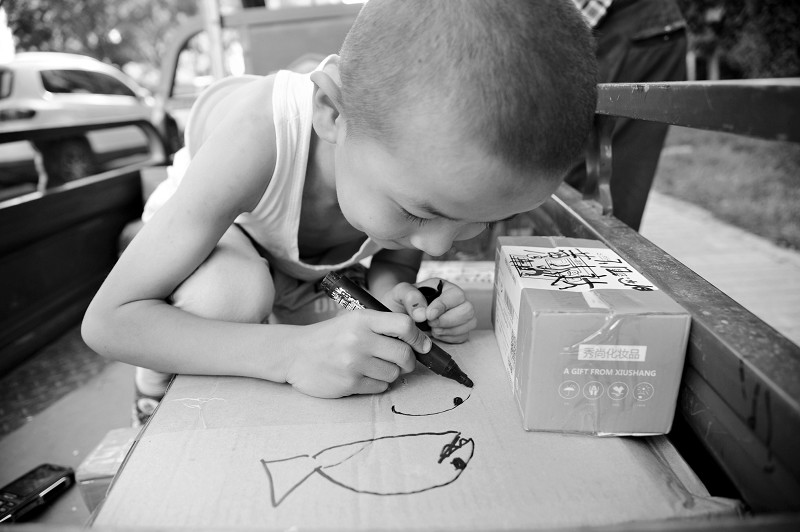 快遞員王貴生,今年49歲,靜樂人,右臂殘疾。7歲的兒子小志偉放暑假后,就跟著他每天穿梭在太原的大街小巷送快遞。爸爸負責拆件、分揀,兒子負責打電話通知客戶。 (胡續(xù)光 攝)