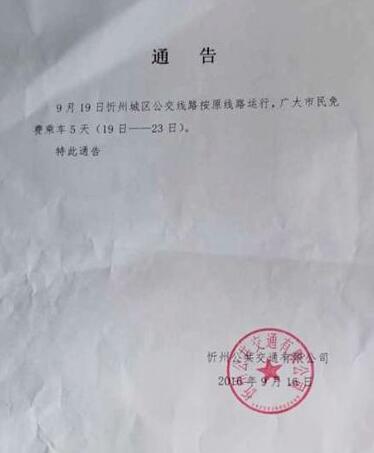 9月19日忻州城區(qū)公交線路按原線路運(yùn)行,廣大市民免費(fèi)乘車(chē)5天(19日——23日)。