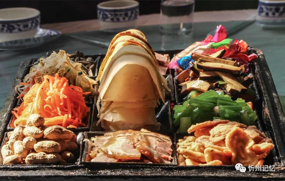 水菜盒子,是一個(gè)木制的長(zhǎng)方形盒子,長(zhǎng)約40多厘米,寬約20多厘米,高約10多厘米。木盒分蓋子和底座,底色多漆為紅黑兩色。蓋子上有的還畫(huà)有人物、山水、花卉等圖案,為描金漆處理。底座內(nèi)有12個(gè)木制的小長(zhǎng)方形碟子,以3行4列的形式排列,用來(lái)裝涼拌菜。傳統(tǒng)的涼拌菜為四葷、二素、六干果,但后來(lái)大多演變?yōu)樗娜?、四素、四干果。其中的“四葷”為雞蛋餅、冷片肉、蒸肉、鹵肉;“四素”幾乎全是清淡的蔬菜,如綠豆芽、胡蘿卜、土豆絲、菠菜、胡芹等;“六干果”分別是葵花子、水果糖、南瓜子、油蛋蛋、金銀棗、蝦片。在忻府區(qū),過(guò)去家家戶戶但凡婚喪嫁娶,總要上水菜盒子,這就是老忻州人好說(shuō)的“八八六六”。其中“八八”即水菜盒子(除去里面的干果正好8小碟菜),代表涼菜。
