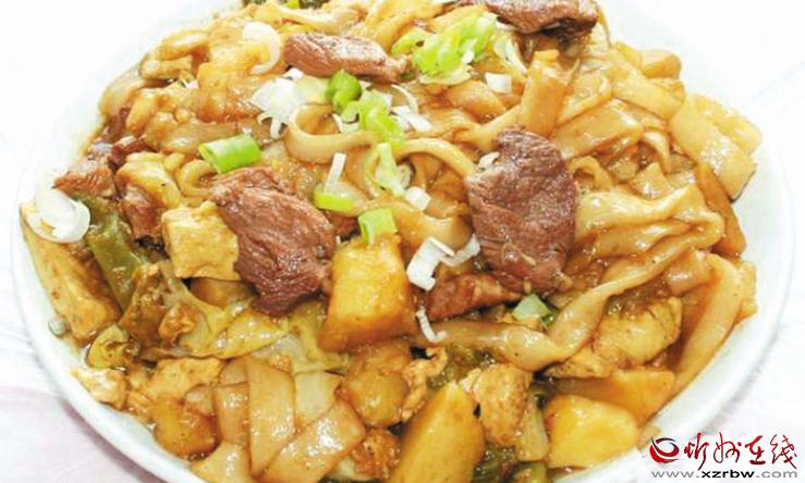 豆面稍加白面制成的豆面河撈是五寨當(dāng)?shù)氐奶厣s糧主食,經(jīng)特制的河撈床下到鍋里,待面壓到一定長度,截斷面條,煮熟后配上各種澆頭,吃著筋滑利口。(張志遠)