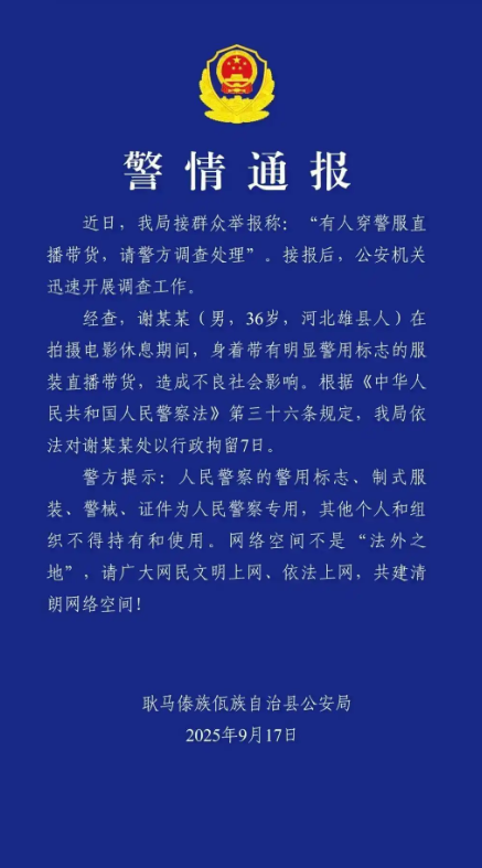 近日,演員謝孟偉(網(wǎng)絡(luò)俗稱“嘎子哥”)在直播帶貨過(guò)程中身穿警服,被公安機(jī)關(guān)依法處以行政拘留七日的處罰。該處理結(jié)果獲得輿論普遍支持,體現(xiàn)出社會(huì)對(duì)公權(quán)力象征符號(hào)神圣性的共同維護(hù)。據(jù)通報(bào),謝某在電影拍攝休息期間,身著配有警用標(biāo)志的制式警服公開推銷電子產(chǎn)品,并聲稱“穿警服需通過(guò)政審”“公安機(jī)關(guān)應(yīng)當(dāng)配合工作”,企圖利用警服所承載的公信力為其商業(yè)行為背書。