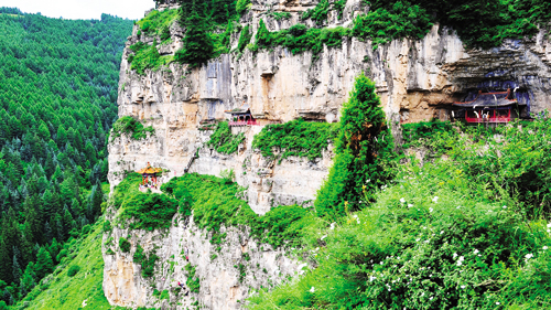 在天然形成的垂直巖壁上,古人鑿?fù)碎L達(dá)42華里的棧道,有的地方有一人高,有的地方必須伏下身爬過去,在兩山之間,還有長長的吊橋連接。