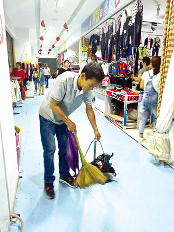 整個云河商場只有一層,共60多家商戶,衛(wèi)生清潔一天3次,工作量雖然不是很大,卻也不輕松。記者見到老馬時,他正在做商場關門前的最后一次清掃。不時有商戶喊老馬過去收紙箱和塑料袋,老馬加快了手里的動作?!吧虉鍪枪矆鏊芾硪餐栏竦?,我得隨時注意看哪里有了垃圾,或是公共設施出了問題,要不人來人往怕出事。干凈整潔的環(huán)境代表著商場的形象,也能讓顧客購物時有個好心情,這也是我工作的價值吧?!崩像R坦言,有的人衛(wèi)生習慣特別不好。商場里童裝生意最為火爆,有個別帶孩子的家長直接讓孩子隨地大小便,不僅弄臟了環(huán)境也作了不良示范。老馬希望通過創(chuàng)衛(wèi),大家愛護環(huán)境衛(wèi)生的意識得到提高,這樣他也可以輕松點了。(王菲)
