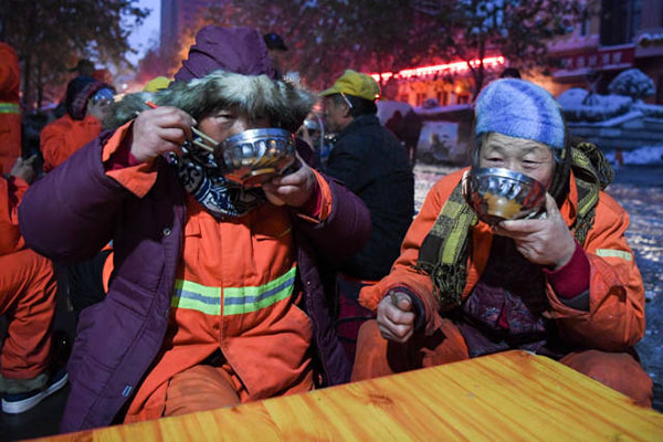 百度貼吧網(wǎng)友“馬克斯基”說:“下雪天路過鄭州廣電南路愛心粥屋,寒風中200多位環(huán)衛(wèi)工人圍坐在一起喝著熱騰騰的粥,有說有笑,我流淚了。此刻,愛心粥屋就是我們‘城市美容師’的家。”